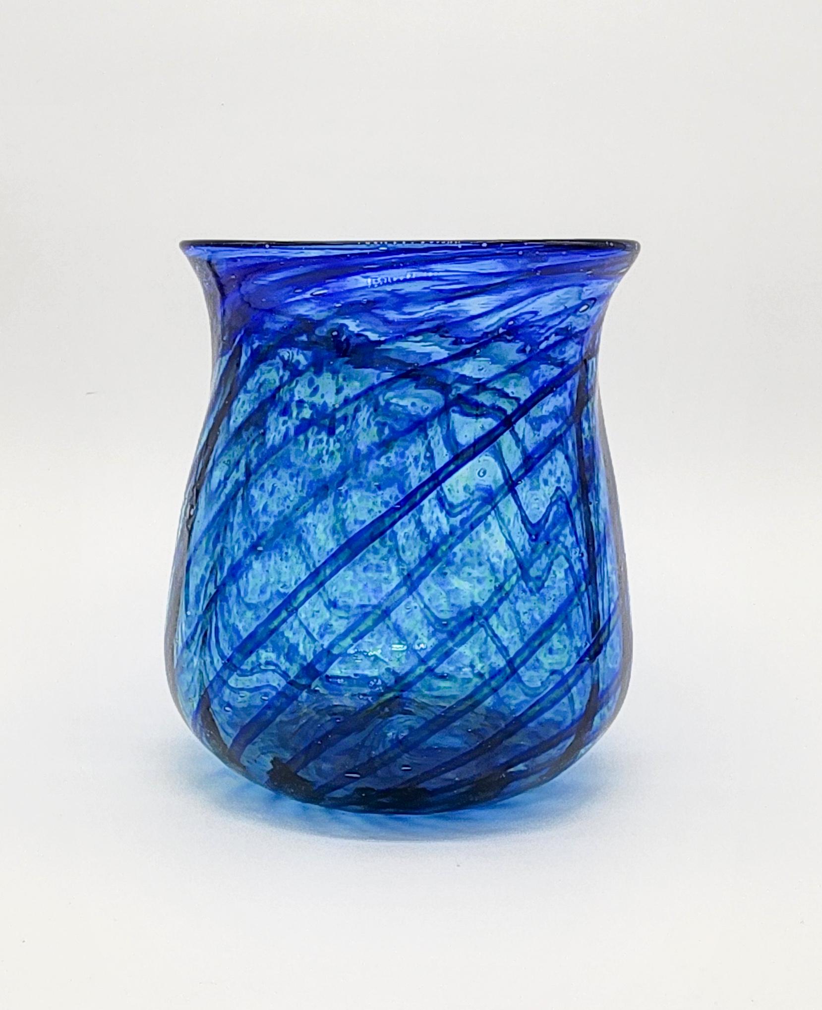 Taller than a pint glass but wide enough to fit two bouquets. This Vase is excellent for a dinner table flower arrangement providing a low height Vase that doesn't block the line of sight. Featuring cerulean blue and Emerald green in an sky like expression.